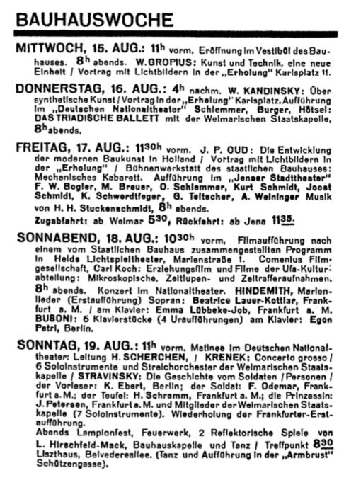 At the 1923 Bauhaus Exhibition, Walter Gropius curated a number of contemporary music concerts to showcase the Bauhaus’s commitment to the latest artistic trends (Trimingham 216, 107). Hermann Scherchen conducted Stravinsky’s The Soldier’s Tale and Krenek’s Concerto Grosso No. 1, and there were also performances of Hindemith’s Das Marienleben and Busoni’s Five Short Pieces.